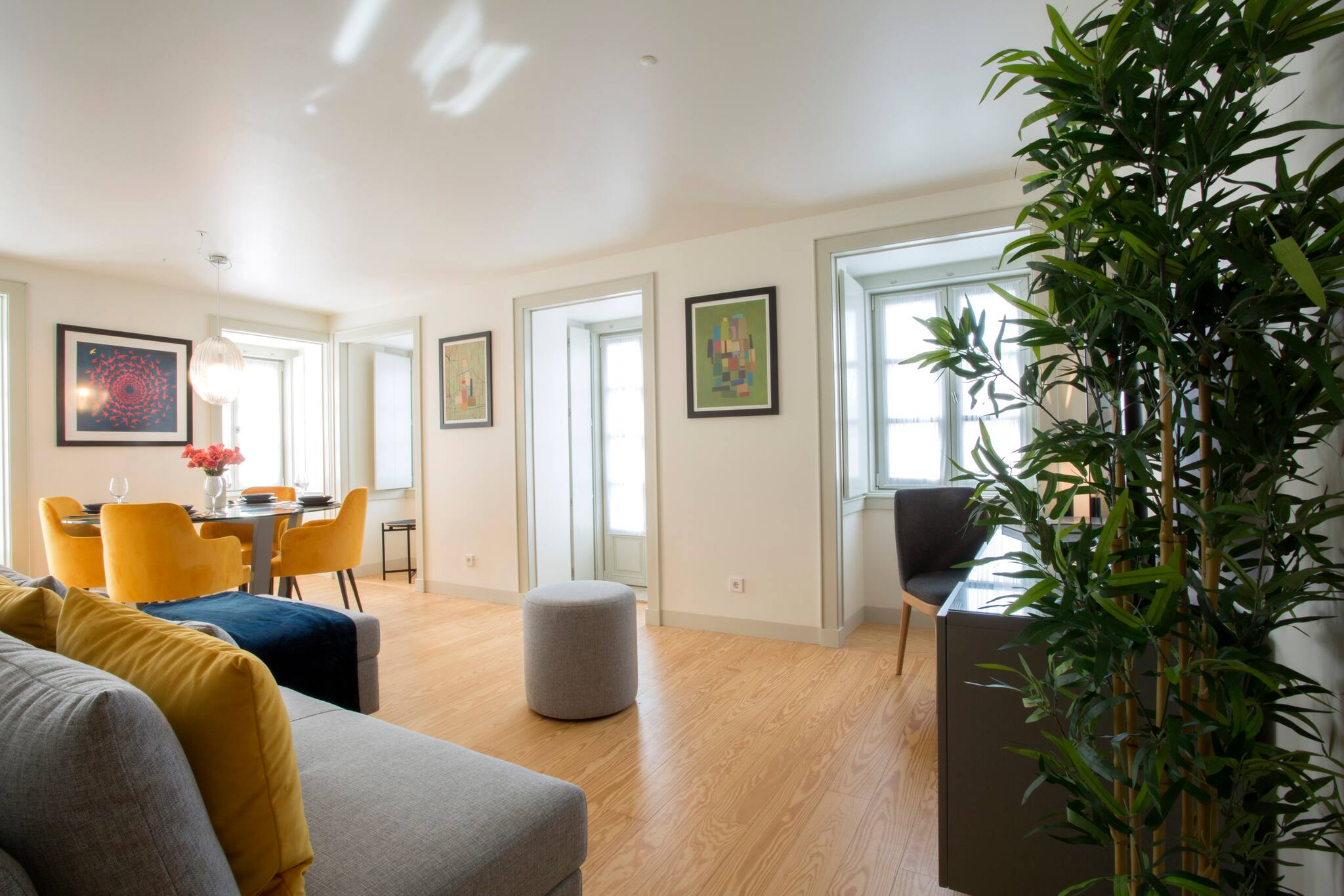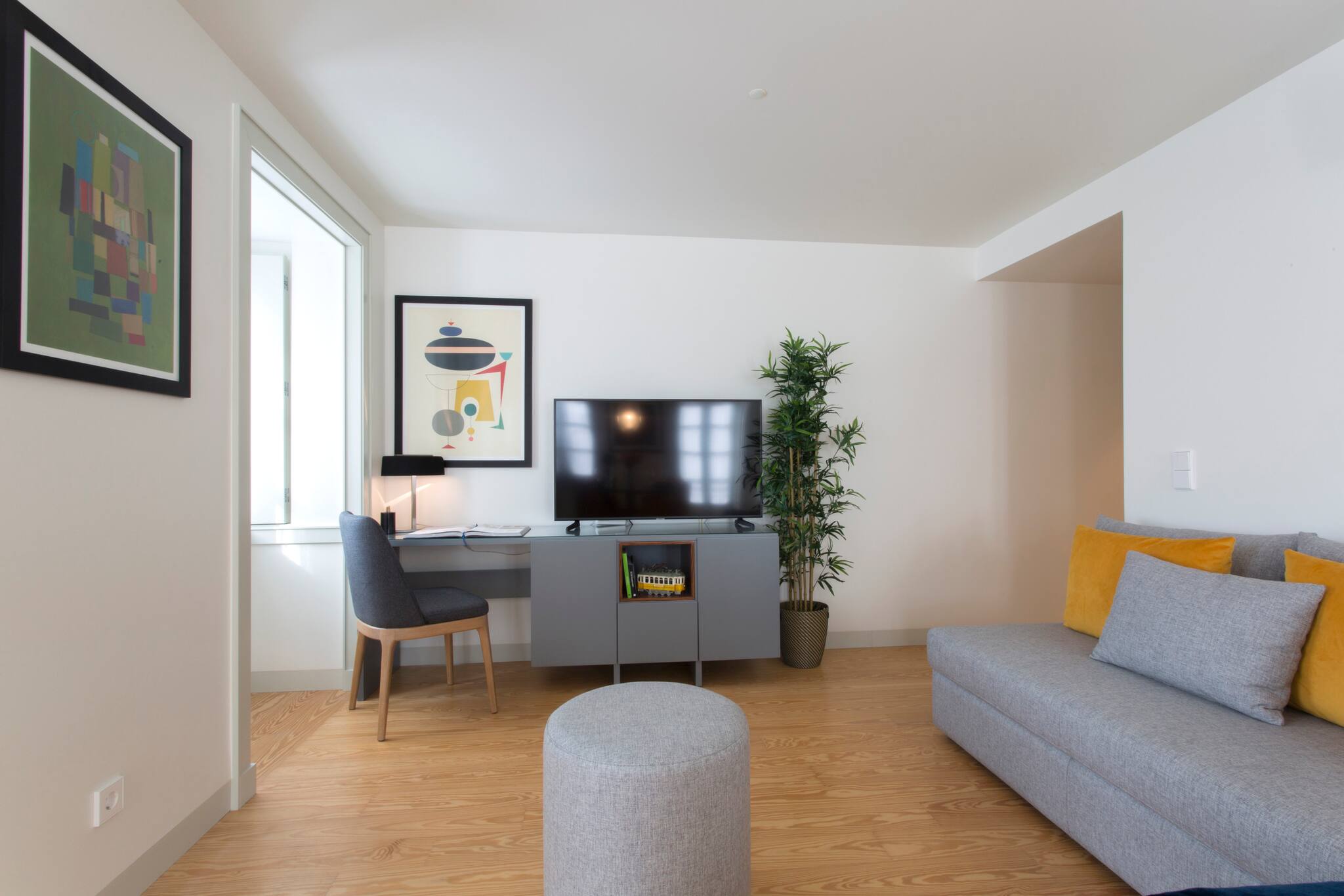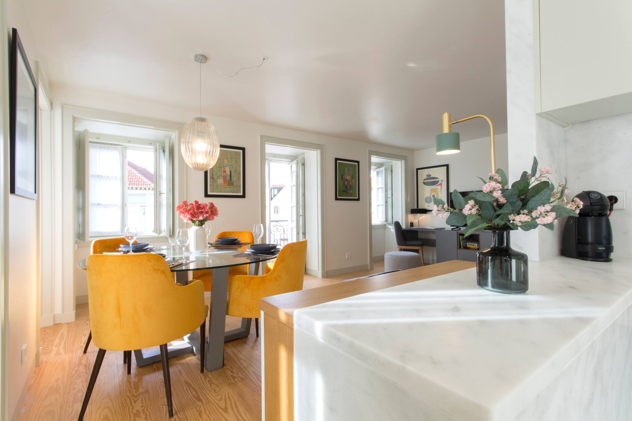 O apartamento conta com dois quartos confortáveis, oferecendo flexibilidade de acomodação: um quarto com cama de casal e outro com duas camas individuais. A luminosidade e o design moderno criam um ambiente acolhedor e relaxante, perfeito para descansar após um dia explorando a vibrante cidade de Lisboa.