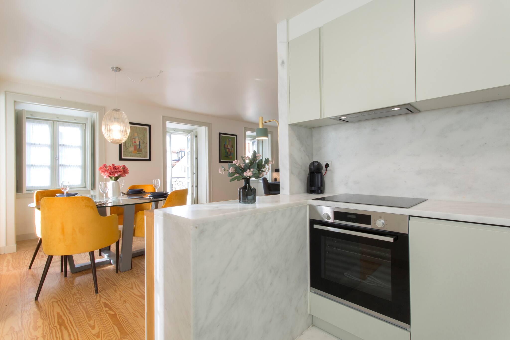 A cozinha totalmente equipada permite que os hóspedes preparem suas próprias refeições, com todos os eletrodomésticos essenciais: fogão, forno, micro-ondas, máquina de café, frigorifico, máquina de lavar e utensílios completos. Uma área de refeição com mesa de jantar completa o espaço.