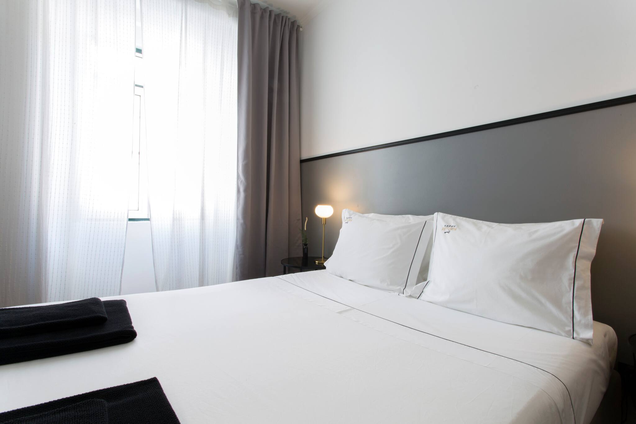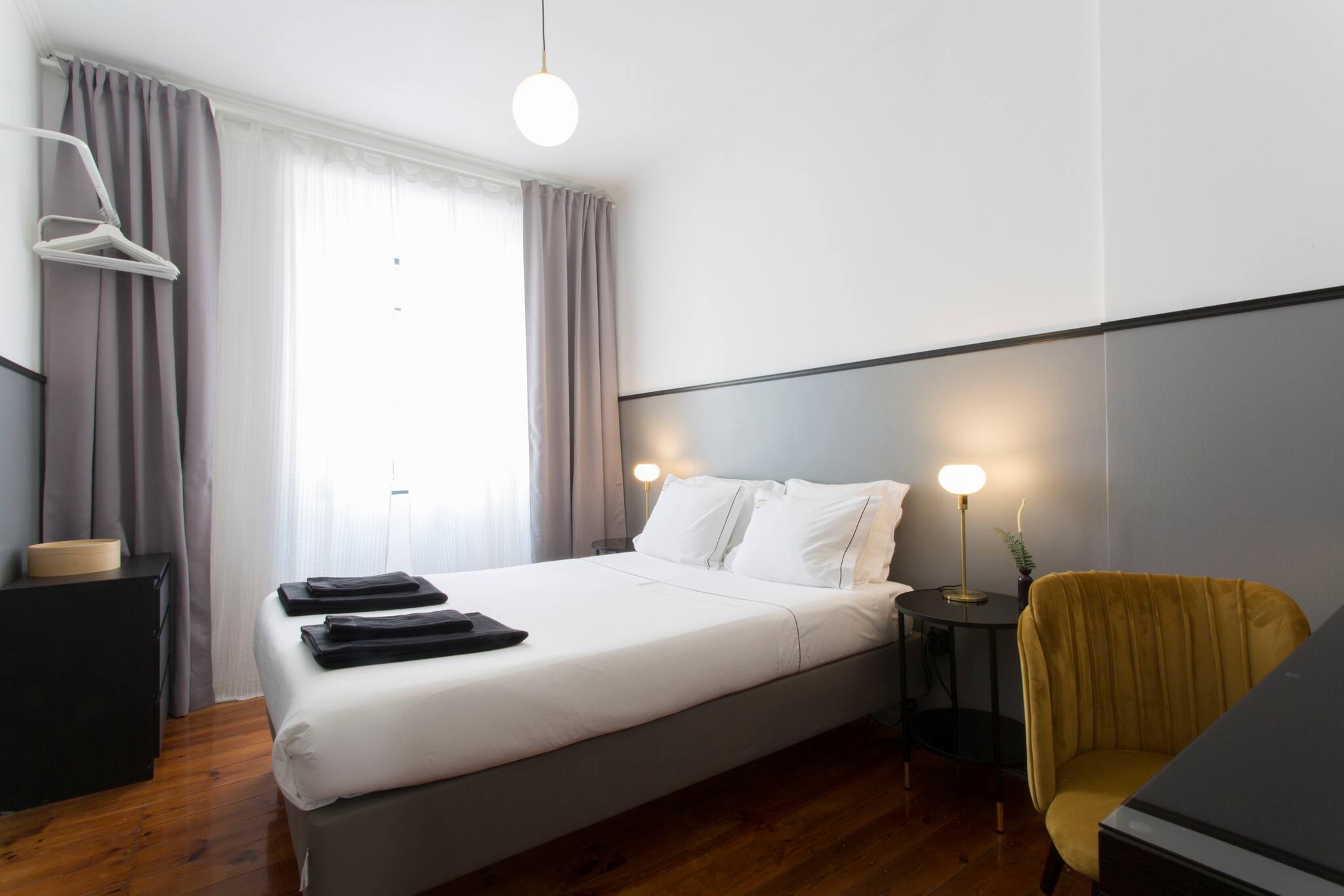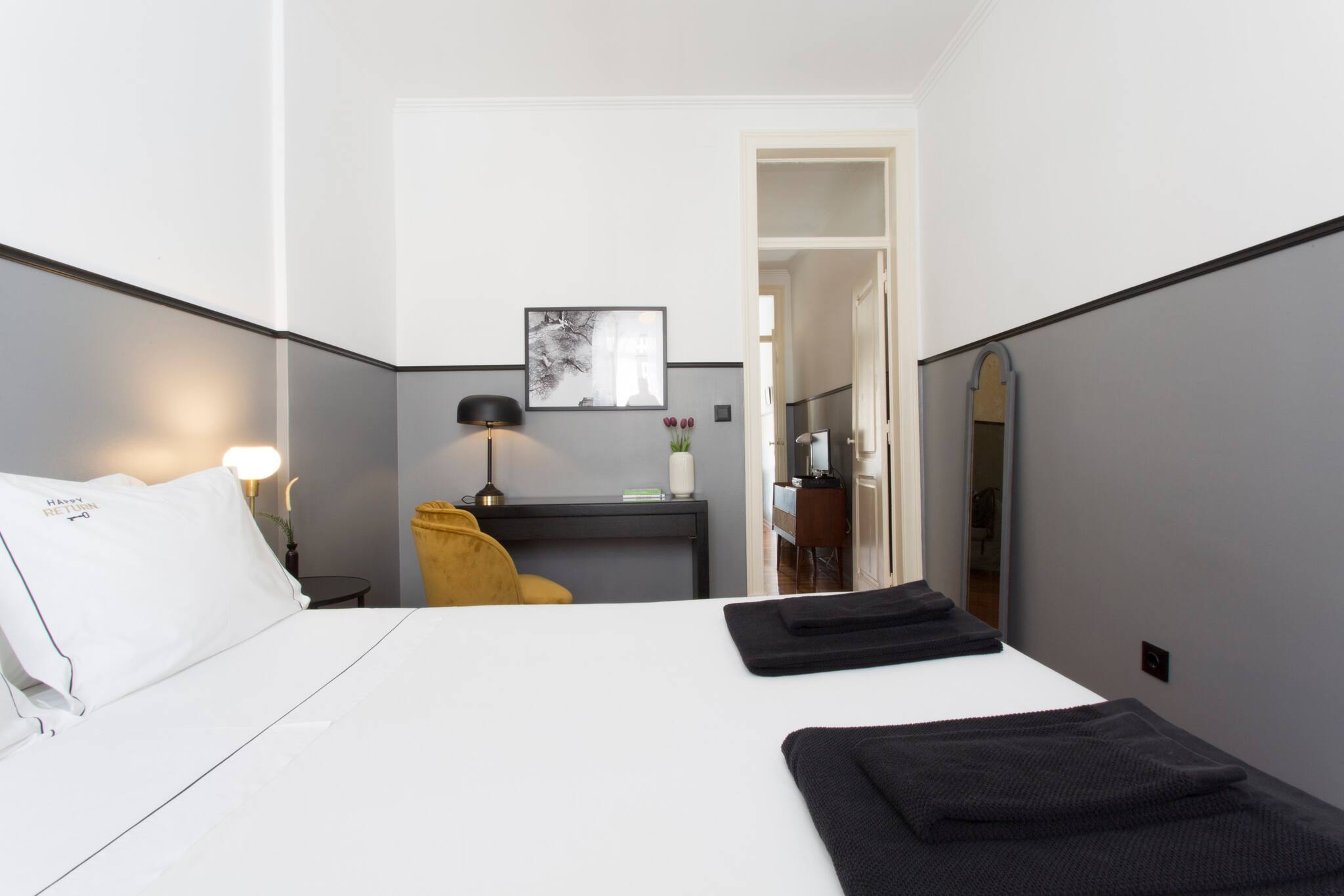 O apartamento conta com dois quartos confortáveis, oferecendo flexibilidade de acomodação: um quarto com cama de casal e outro com duas camas individuais. A luminosidade e o design moderno criam um ambiente acolhedor e relaxante, perfeito para descansar após um dia explorando a vibrante cidade de Lisboa.