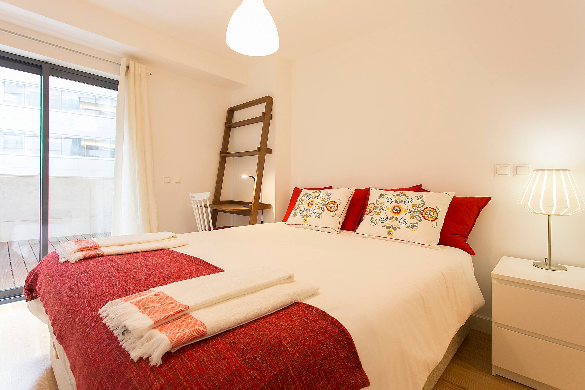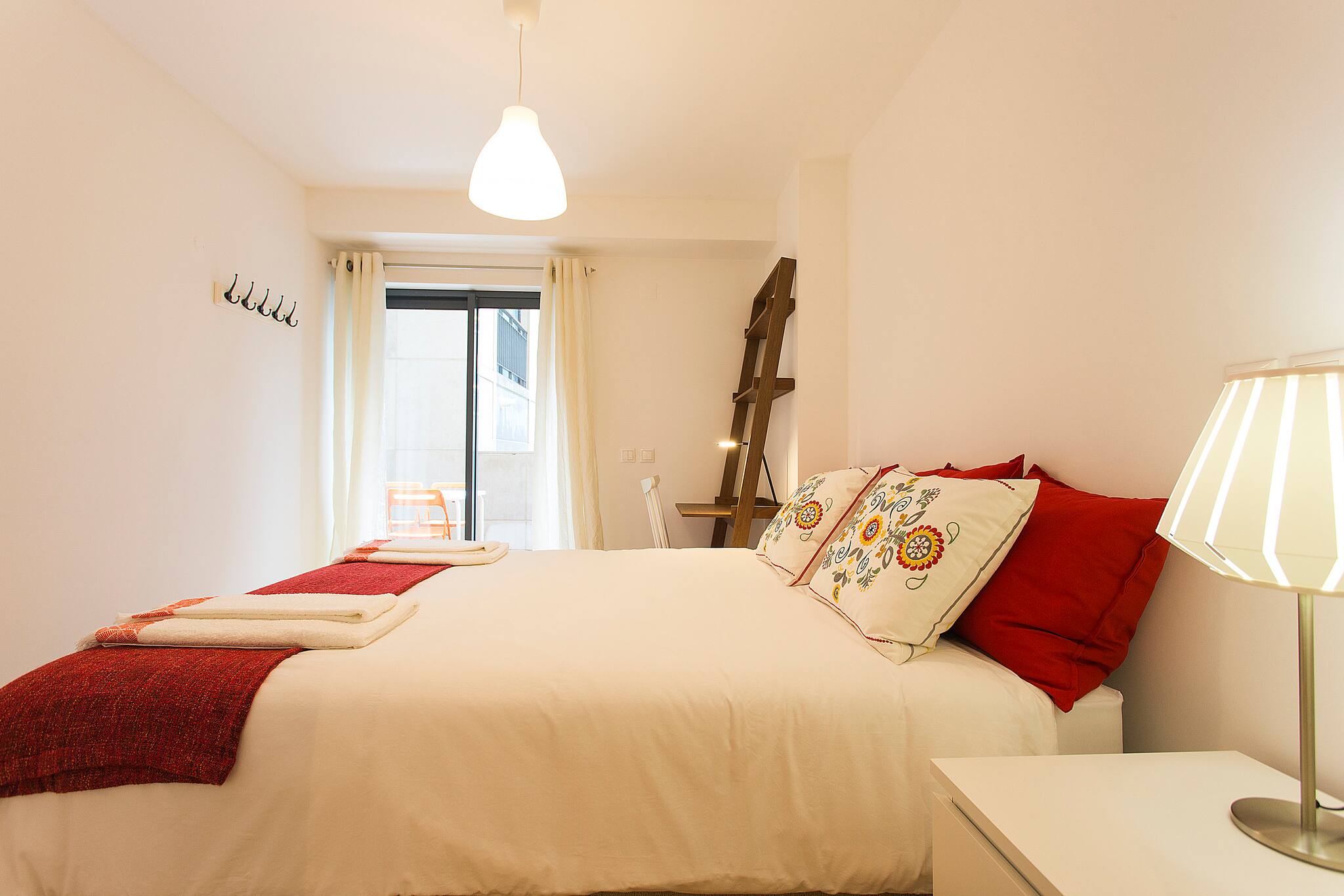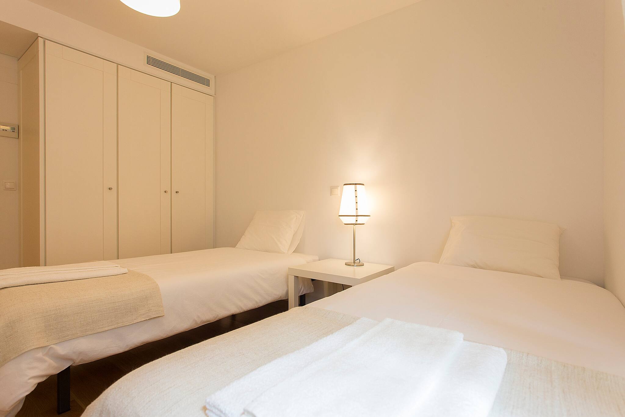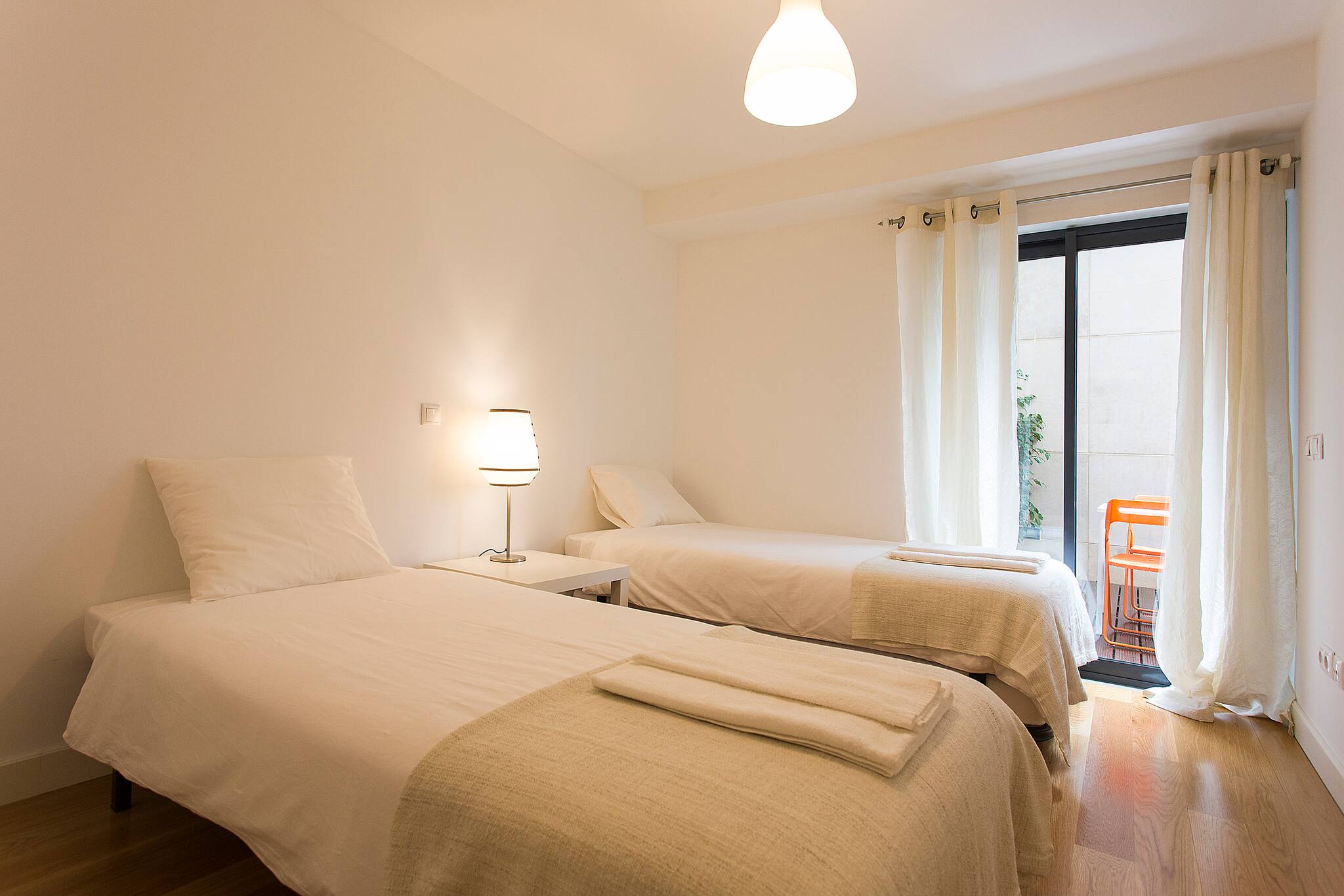 O apartamento conta com um quarto com cama de casal e outro com duas camas individuais, perfeito para famílias, grupos de amigos ou viajantes que buscam privacidade. A luminosidade é controlada por cortinas blackout e persianas que garantem um descanso tranquilo.