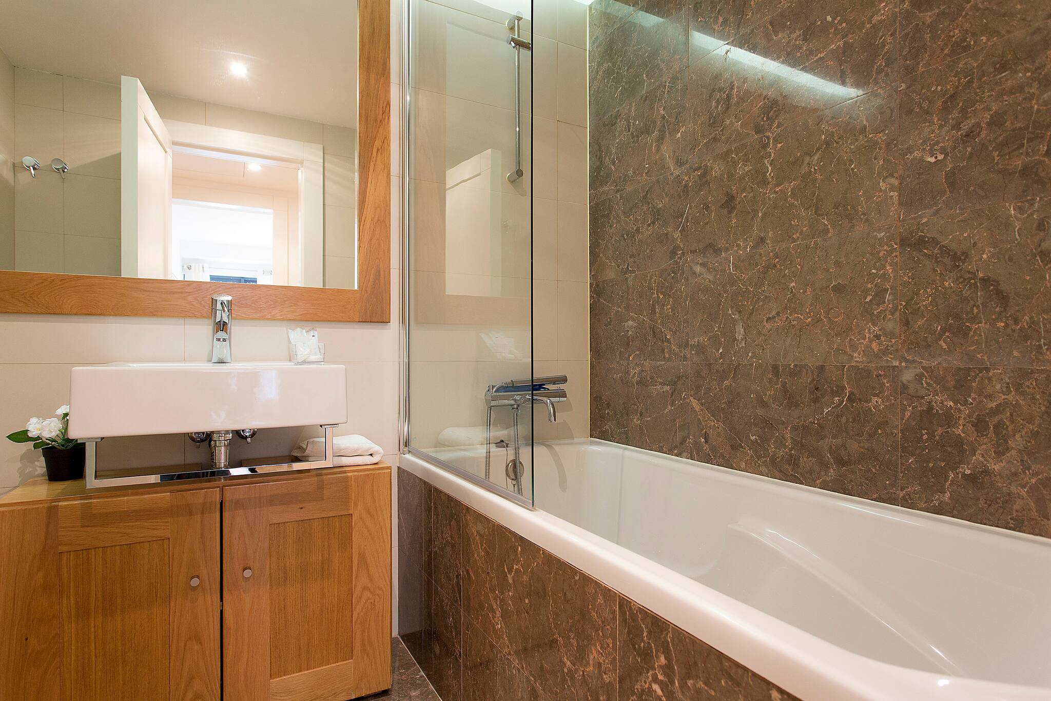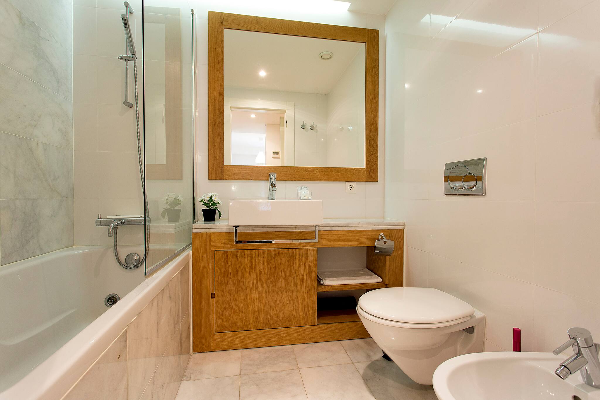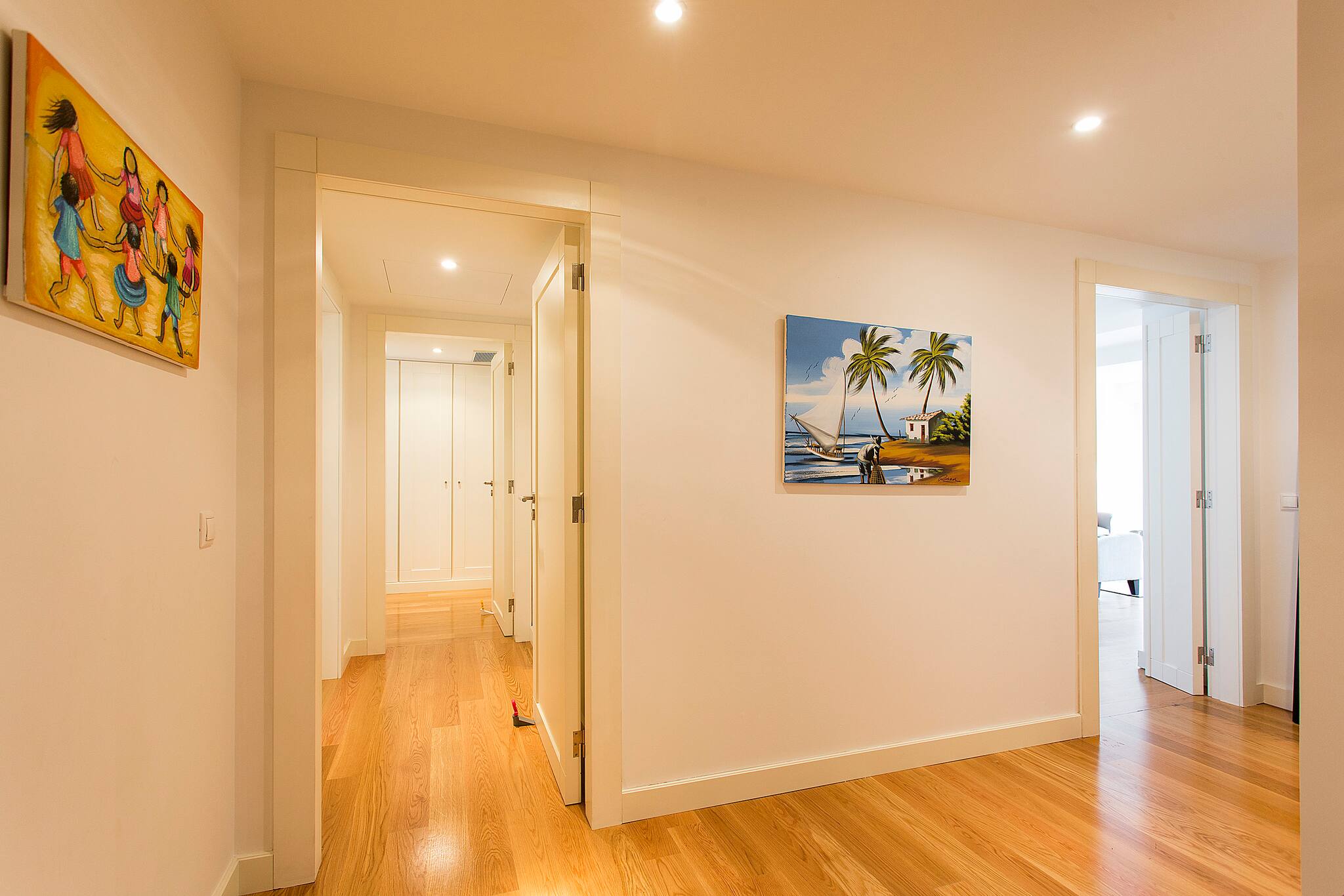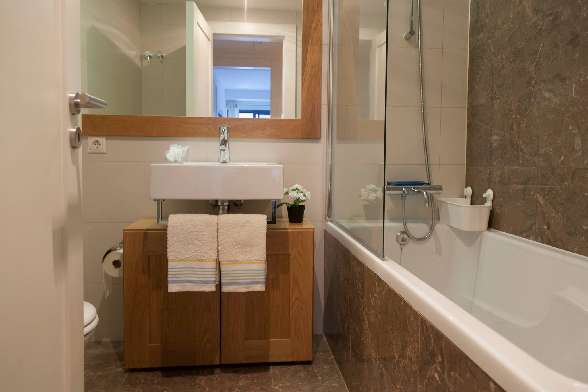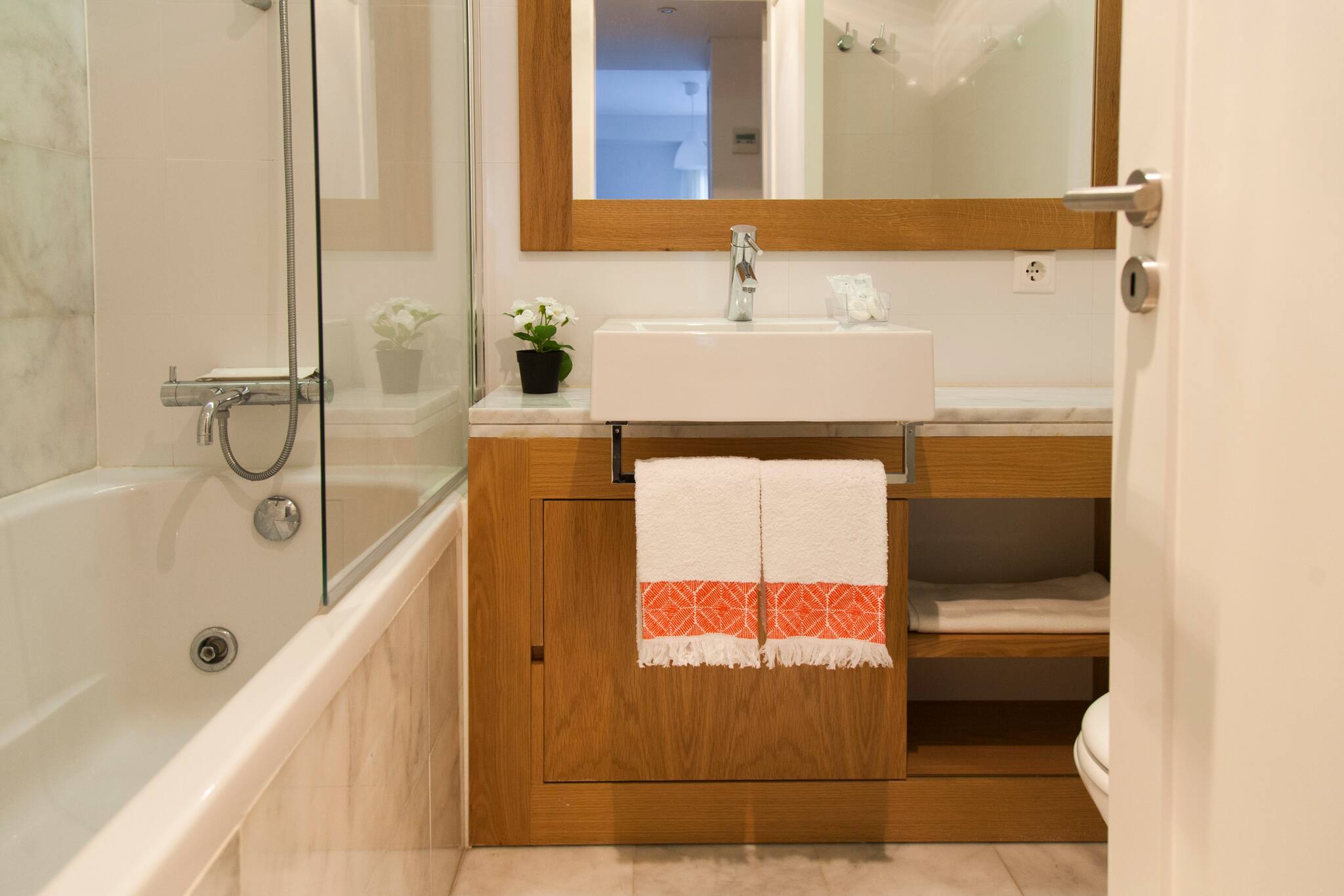 O apartamento conta com dois quartos confortáveis, incluindo uma cama de casal queen size e duas camas individuais, garantindo um descanso tranquilo para todos os hóspedes. Dois casas de banho completamente equipadas - uma com chuveiro e outra com banheira - proporcionam comodidade e privacidade.