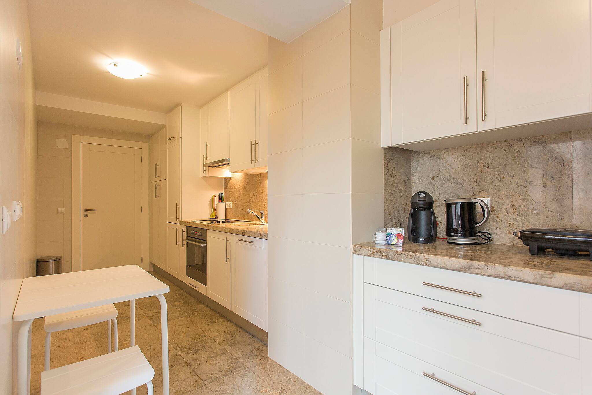 A cozinha moderna está totalmente apetrechada com eletrodomésticos de última geração, incluindo fogão, frigorífico, máquina de lavar, forno, máquina de lavar louça, micro-ondas e máquina de café. Perfeita para quem gosta de preparar refeições em casa ou desfrutar de um pequeno-almoço relaxante.