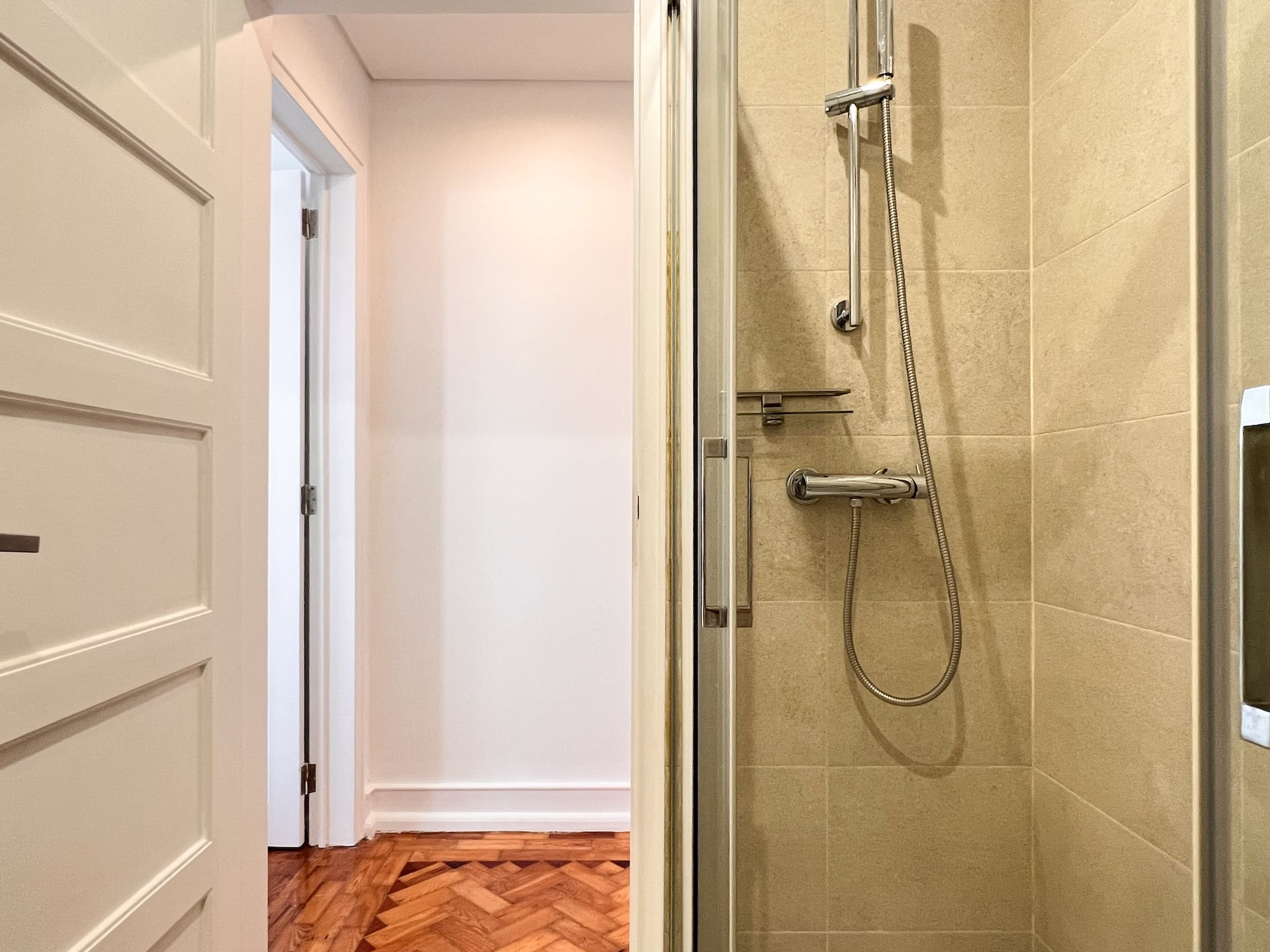 O espaço de banho privativo possui chuveiro, garantindo conforto e privacidade. Foram pensados todos os detalhes para tornar a estadia agradável, com produtos de limpeza, kit de primeiros socorros, cabides e uma mesa de jantar que complementam o ambiente.