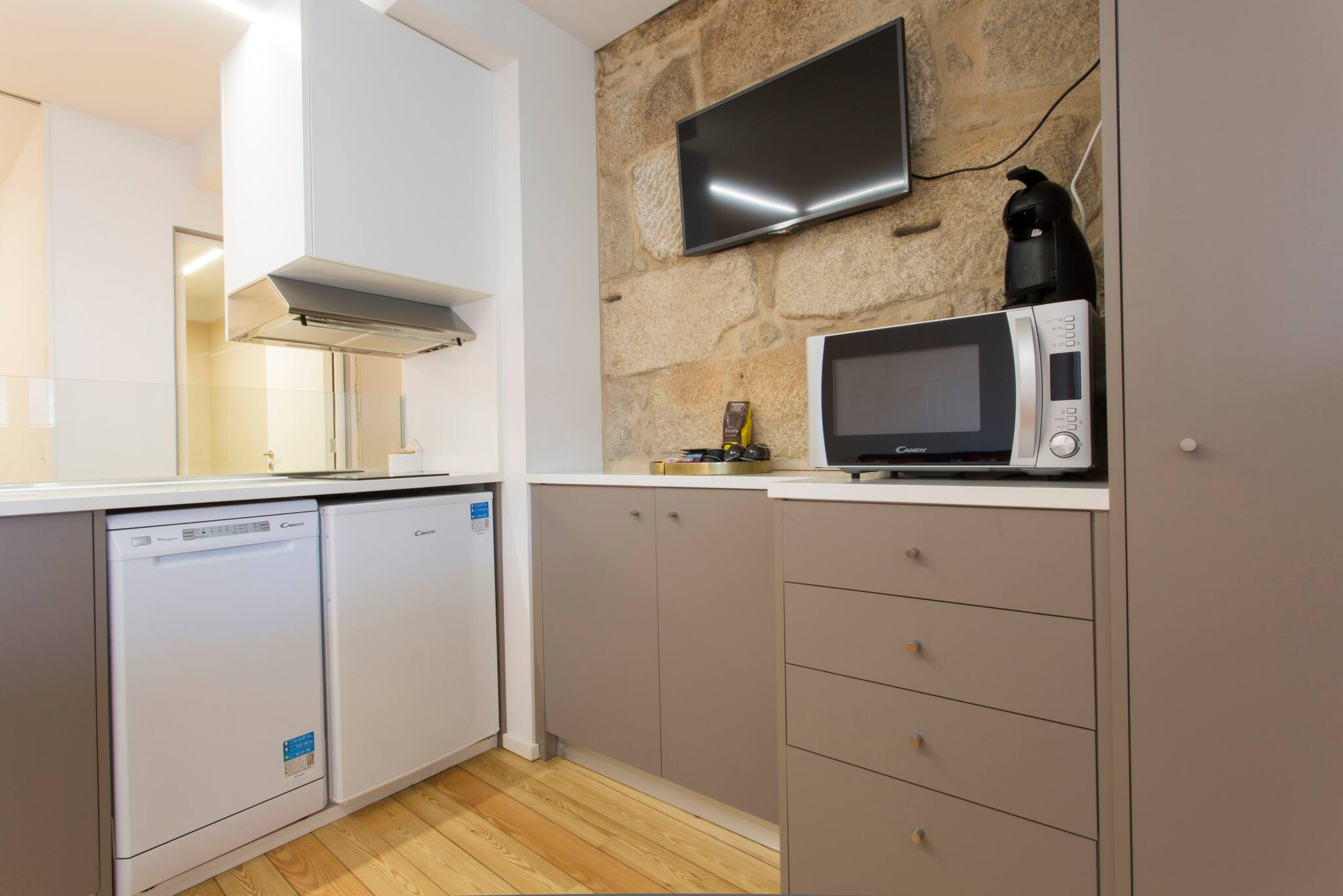 In the hotplate of glass ceramics open plan kitchen, refrigerator, microwave, dishwasher, dishes/cutlery, kitchen utensils, coffee machine, toaster, kettle and hob are provided.